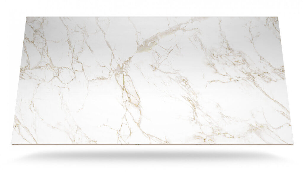 Inspirert av marmoren Calacatta Gold. Realisme og naturlighet er pustet inn mellom tilfeldige former som trekker gylne årer.