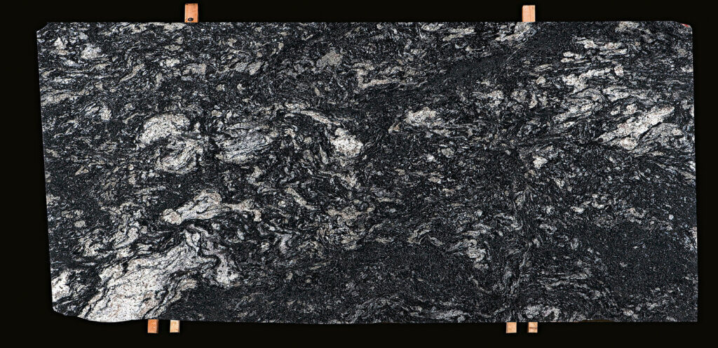 Granitt med mørke og intense fargetoner over det hele. Den sorte bakgrunnen er innfelt med kontrasterende undertoner som er nesten krystallklare, noe som ytterligere fremhever granittens skjønnhet.