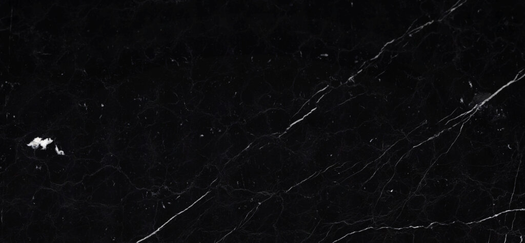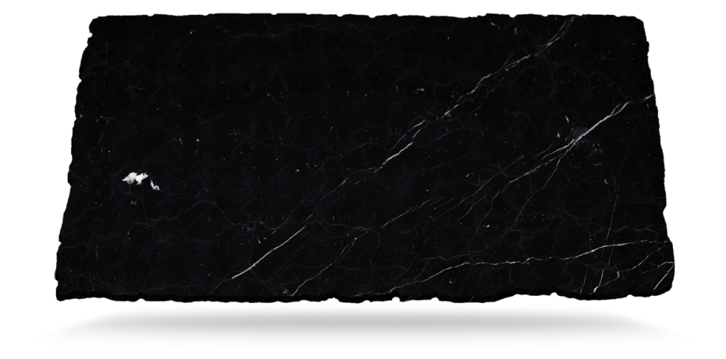 Årene, mer eller mindre konsentrerte, skaper kontrast mot den mørke bakgrunnen av denne svarte marmoren som passer enhver estetikk.