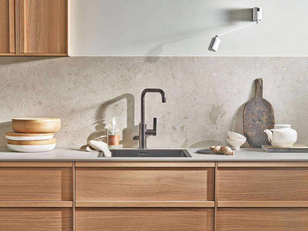 Norrvange Ivory Matt er en keramisk benkeplate med matt overflate og en rik variasjon av fossilaktige og naturlige detaljer. Skivene er inspirert av den gotlandske kalksteinen. Svært naturlig og detaljert.