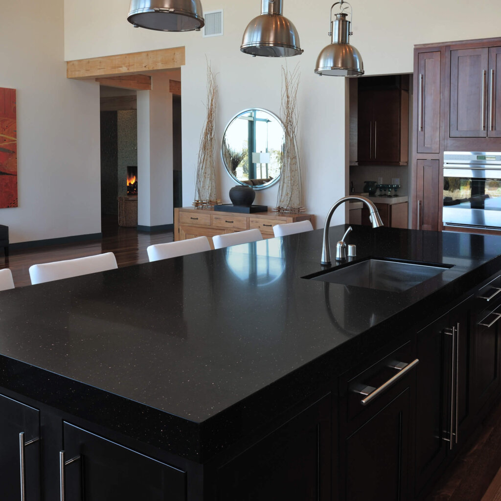 Kullsort granitt med middels store, mørkegrå korn. Fra India, hvor kullsvarte fargetoner dominerer.